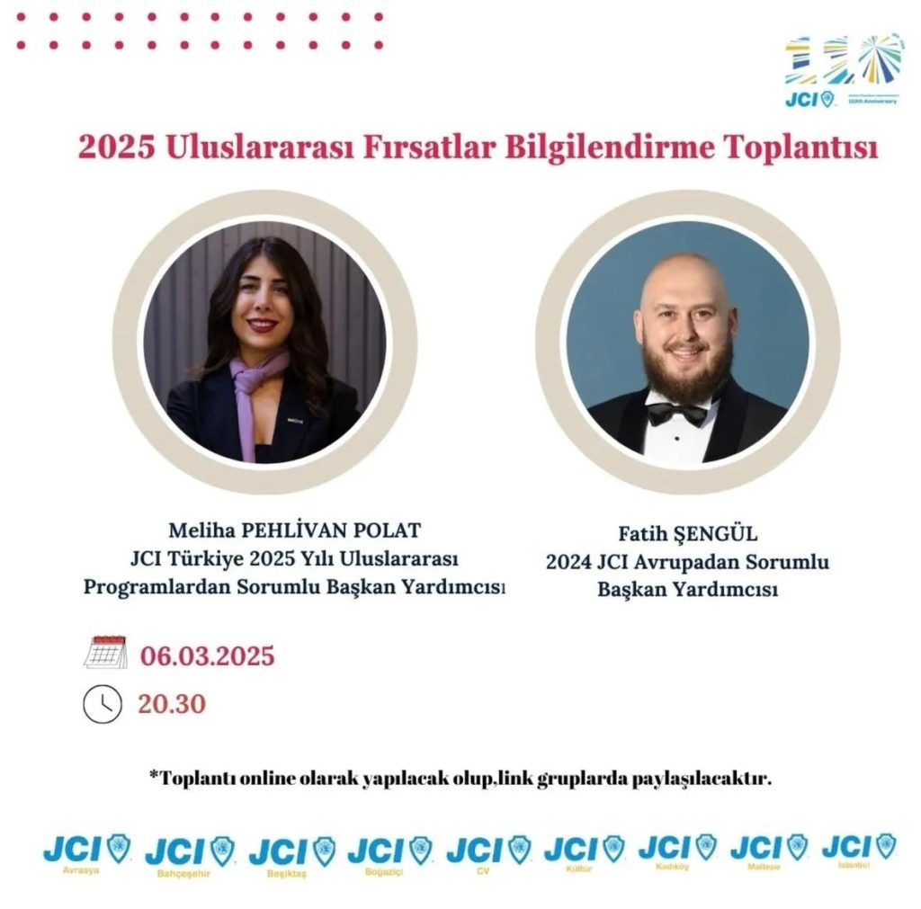 JCI Türkiye İstanbul ili yerel organizasyonları tarafından düzenlenen webinarda; JCI Türkiye ve JCI Avrupa’nın deneyimli isimlerinden JCI’ın uluslararası fırsatlarını dinleyeceğiz.